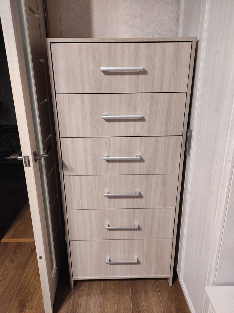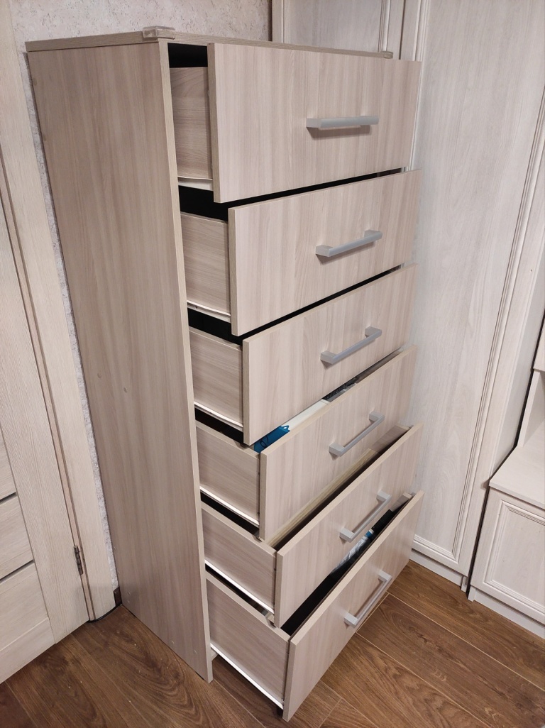 Давно хотел купить вместительный комод,но большинство комодов не подходили мне по размерам,либо расцветка не подходила к интерьеру.И тут,вновь обратившись к поиску,зашёл на сайт bestmebelshop.by и увидел подходящее изделие,к тому же все нужные размеры,цвет,материал изготовления, комплектацию можно выбирать самому,что оказалось весьма кстати.Составил мой будущий комод прямо на сайте и отправил запрос.Вскоре перезвонил оператор и уточнил некоторые детали.Время на изготовление и доставку определили и уложились в это время в срок.Доставка прошла безупречно,изделие в трёх упаковках было доставлено без повреждений.Далее предстояла сборка.Распаковав все упаковки,испугался множества мелких деталей,но благодаря хорошо исполненному чертежу и безупречному изготовлению самих деталей и точной разметке на них,сборка прошла без особых затруднений.Фурнитуры хватило с запасом.Не было такого,чтобы чего-то не хватило.Комод оказался большим,высоким и вместительным,как я и хотел.Качеством всех изготовленных деталей и собранным изделием остался доволен.Большое спасибо всей команде!