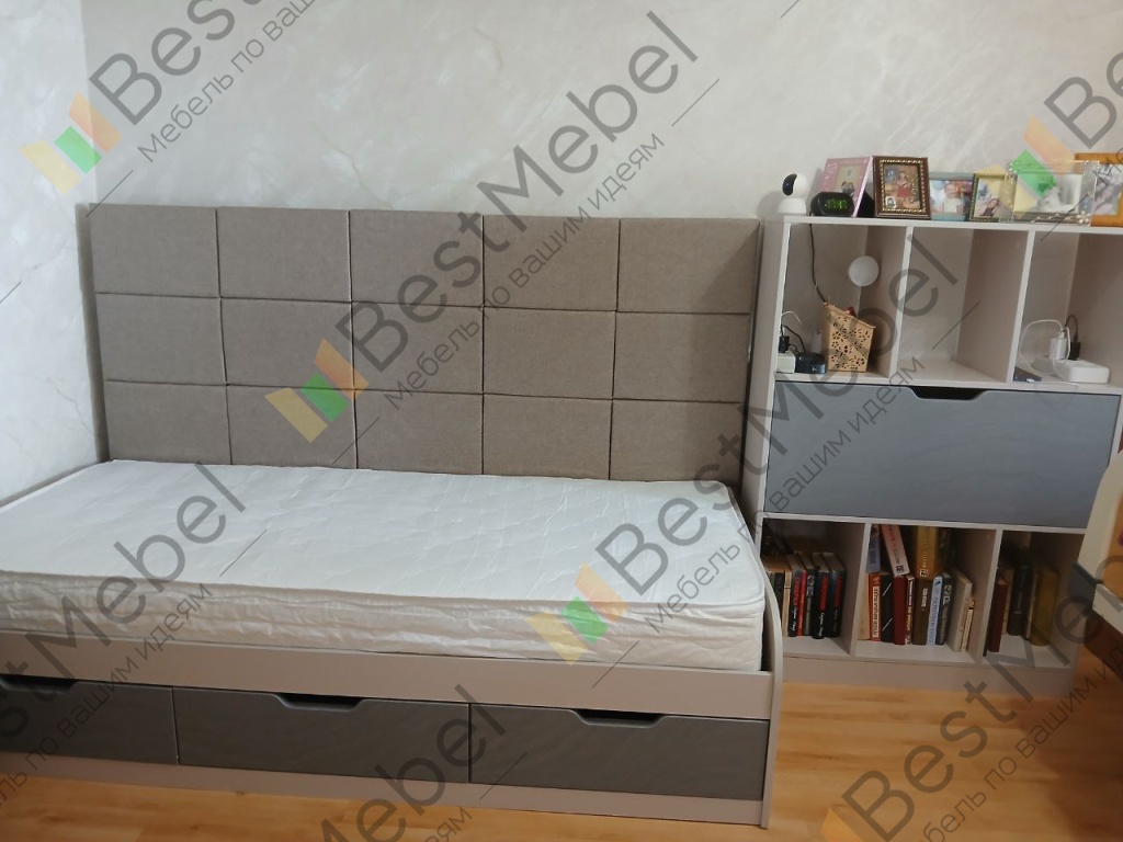 Модуль шкафа с полками отдельный. В итоге поставили его сбоку от кровати, т.к. если ставить между кроватью и стенкой, то к нижним полкам нет доступа. Поэтому пришли к выводу, что проще было бы купить отдельно кровать и отдельно шкаф с полками. Вышло бы дешевле и можно было бы шкаф заказать с большим количеством полок. В остальном всё устроило. Ящики под кроватью - супер удобно.