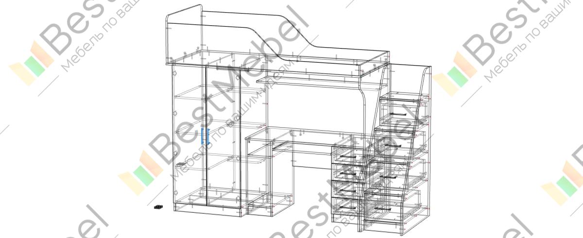 Детская кровать со шкафом Мартин 1 BMS поможет вам сэкономить пространство, объединив зону отдыха, рабочую зону и удобную систему хранения. Практичная композиция включает в себя спальное место второго яруса с защитным бортиком, компьютерный стол с тумбой, нишей под системный блок и выкатной панелью для клавиатуры, книжные полки и распашной шкаф для одежды. Устойчивая приставная лестница-комод станет незаменимой для хранения игрушек, постельных принадлежностей и прочих вещей ребенка. Купить детскую кровать со шкафом Мартин 1 BMS приглашаем в наш интернет-магазин.