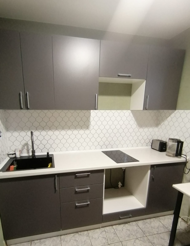 Хорошая бюджетная кухня.Можно использовать встроенную технику. Общая столешница .Быстрая Сборка мастером.