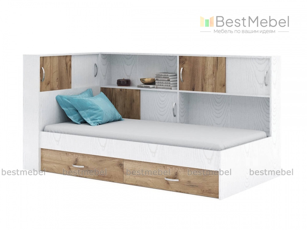 Кровать детская Д-906 BMS спальное место 2000* 800– многоцелевая конструкция, которая гармонично объединила кровать с просторным спальным местом и удобную систему хранения. Отличное решение для подростковой комнаты, модель в сочетании белого и древесных тонов оборудована выдвижными бельевыми ящиками, открытыми полками и отделениями с раздвижными дверцами. Качественные материалы и надежная фурнитура станут залогом долговечности. Купить кровать детскую Д-906 BMS, которая позволит разместить под рукой все необходимое.