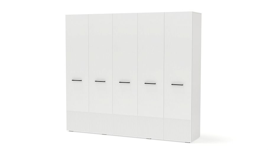Шкаф распашной Декарт 5 BMS сочетает простую традиционную форму и актуальный дизайн. На сплошном светлом фасаде из МДФ выделяются поперечные ручки-скобы и фрезерованный рельеф, создавая визуально легкую конструкцию. Пятидверный гардероб позволяет организовать хранение с помощью пары штанг, вместительных верхних и бельевых полок. Купить шкаф распашной Декарт 5 BMS в удобном размере и любых оттенках из каталога вы сможете на сайте нашего интернет-магазина.