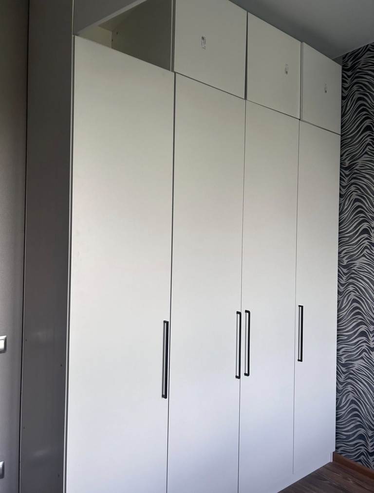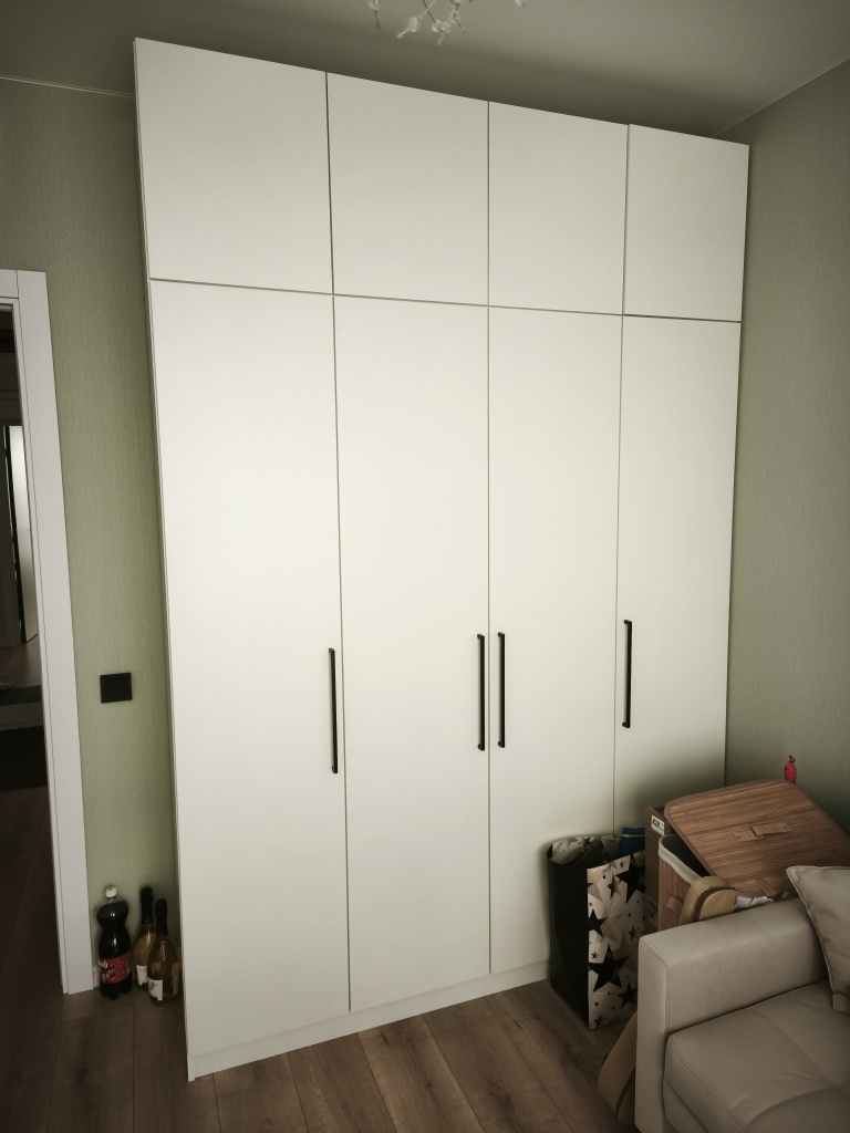 Шкаф покупали в прошлом году. Оформили в мебельном магазине лично. Мы внесли свои коррективы. Все ок. Когда доставили обнаружили, что положили разные ручки для дверей. Попросили заменить. Привезли на следующий день, но снова не такие. Решили уже забыть. (Брючницу на фото уже докупали сами)