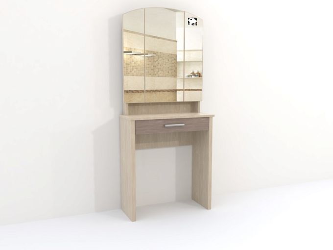 Небольшое трюмо для спальни в традиционном, классическом стиле. Трехстворчатое зеркало – лучший вариант для создания причесок и удобно для ежедневного ухода за собой. На полочках за его створками в порядке разместятся косметические средства и аксессуары для волос. Под столешницей располагается просторный выдвижной ящик с вкладышем для украшений и изящно декорированной ручкой. Выполняется модель Ривьера BMS в спокойных тонах и отличается безопасными, скругленными углами.