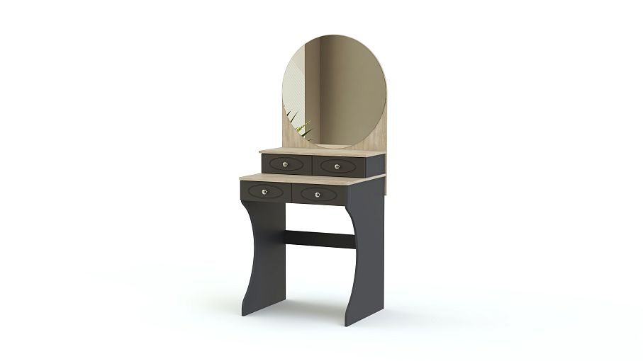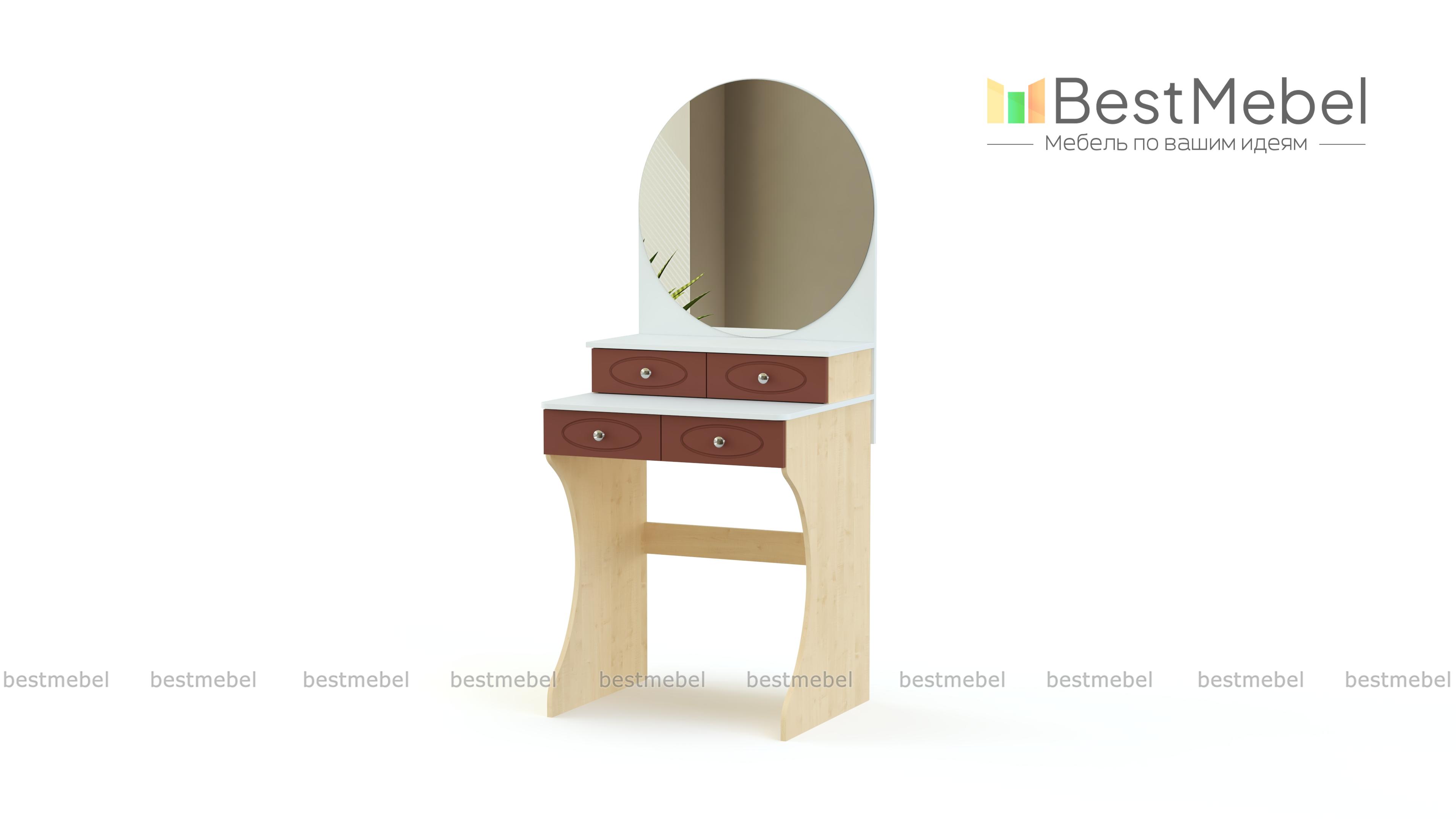 Еще одна романтичная классическая модель для придания законченного образа спальне в стиле прованс или бохо-шик. Легко ее представить и в загородном доме. Женственное круглое зеркало отлично гармонирует с двумя рядами вместительных ящичков для косметики и парфюмерии. Дополняют образ изящно вырезанные боковины, контраст темного и светлого цвета и оригинальная, немного ретро, отделка и фурнитура. С туалетным столиком СТ №3 BMS уход за собой будет настоящим удовольствием.