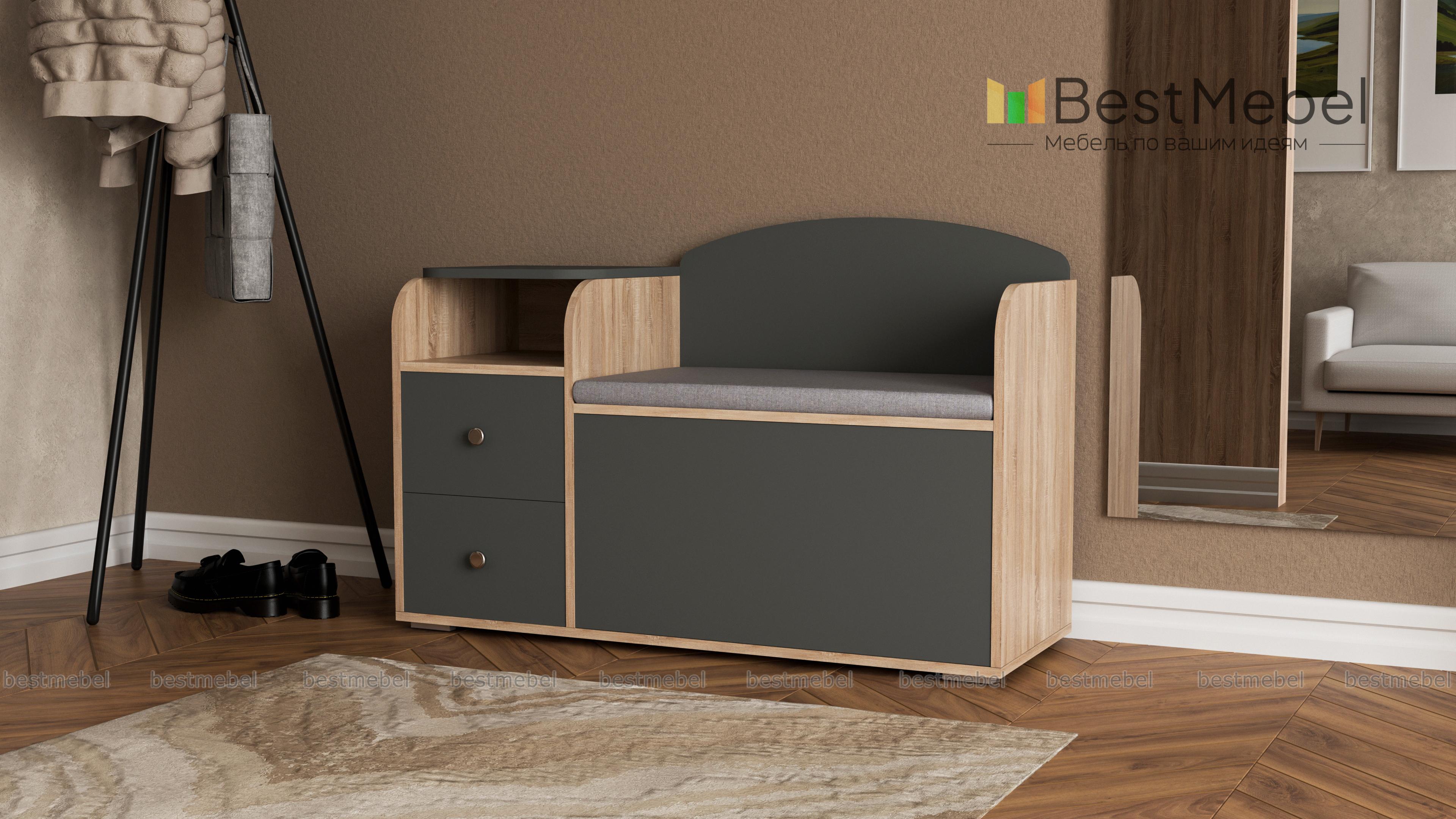 Тумба для обуви классная.Очень симпатично смотрится. Удобная и вместительная.Сидушка мягкая экокожа светлая.