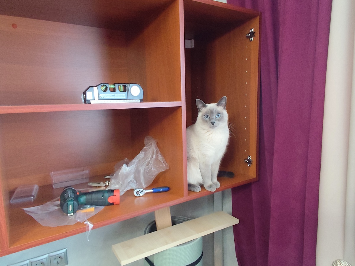 Полка отличная, но конструкция оставляет желать лучшего. Задняя стенка сделана из ДСП толщиной 16 мм. По этой причине полка весит около 50 кг и повесить ее одному невозможно. Понять, что задняя стенка - это лист ДСП при заказе затруднительно. Менеджер тоже этого не сообщает. Переработайте конструкцию. Отдельного описания заслуживает крепеж, на котором должна висеть полка - это четыре самореза ø5 мм. Наверное, повесить полку весом почти 50 кг на 4 самореза, идущие в поставке можно, но наполнять полку я бы не рекомендовал. Саморезы не выдержат нагрузки. А в остальном полка отличная. Кошка довольна.