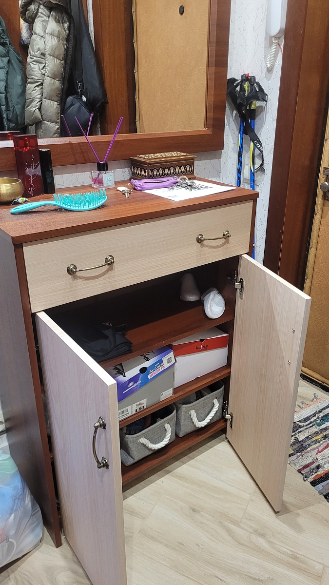 Заказ 00000107416, изделие ЭСКИЗ №00000107416 Тумба для белья Тимини 2 BMS (710х920х370).Тумба на основе Тимини 2 BMS заказывалась по индивидуальным размерам и материалам. Не для белья, а как обувная. За год своей службы она пережила два переезда и осталась в идеальном состоянии. Очень крепкая, функциональная, стильная. Покупалась вместе с зеркалом в таком же цветовом исполнении.