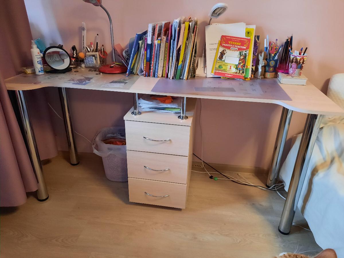 Очень стильный, удобный, негромоздкий, и не выглядящий офисным стол для двух школьниц. Прекрасно вписался в интерьер, не хватает только прорезей для кабелей в столешнице. Одной тумбочки вполне хватает.  Удобные доводчики в ящиках. Не терпит влаги - кот разлил воду, не заметили, столешница вздулась, отошла на закруглении. Обязательно использовать накладки.