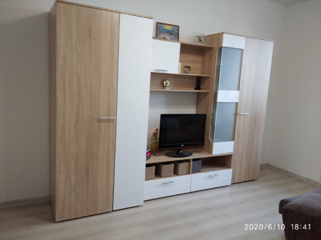 Шкаф нас удивил. Он оказался длинным и тонким (НЕ таким широким и коротким как на ваших картинках). Матового стекла в нем тоже нет. Он весь деревянный (или что там за материал). Мы думали хранить в нем папки, но они, конечно же, НЕ везли. В итоге мы приспособили его под детские вещи и, в целом, довольны. Смотрится стильно, как видите на фото (сверху лежит рамочка, не обращайте внимания). Убираться очень удобно, когда мебель висит. Благодаря вашей компании столы у нас тоже навесные и мы счастливы)